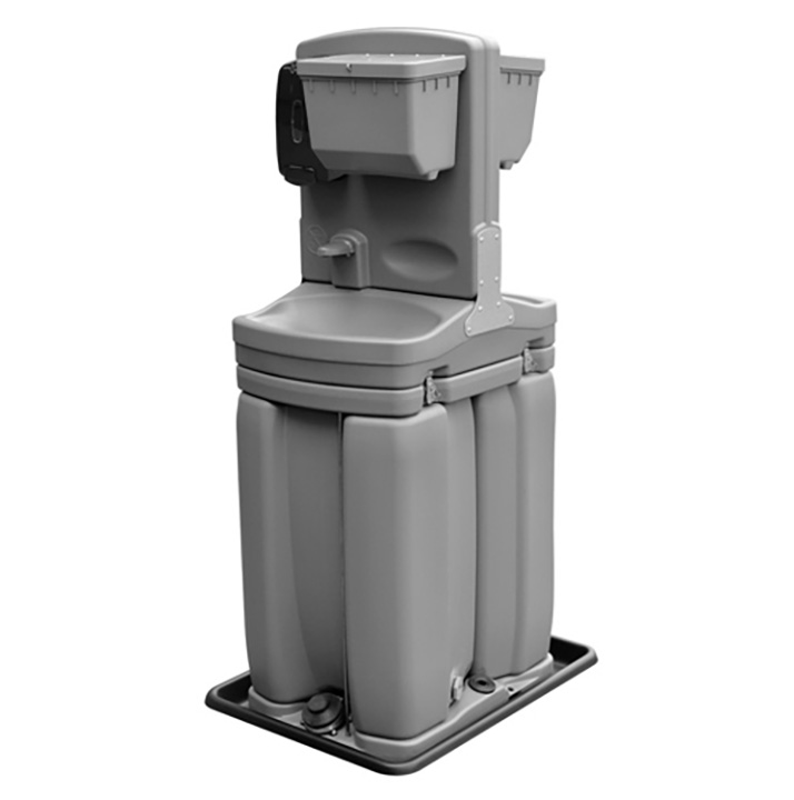 Operator friendly free standing handwash station with two sinks, 2 soap dispensers and 2 towel dispensers. 22 Gallon freshwater tank and 23 gallon grey water tank. Features a containment tray to catch drips and overflow before they hit the ground keeping high-traffic areas cleaner and safer – perfect for job sites or events that demand tidy setup.